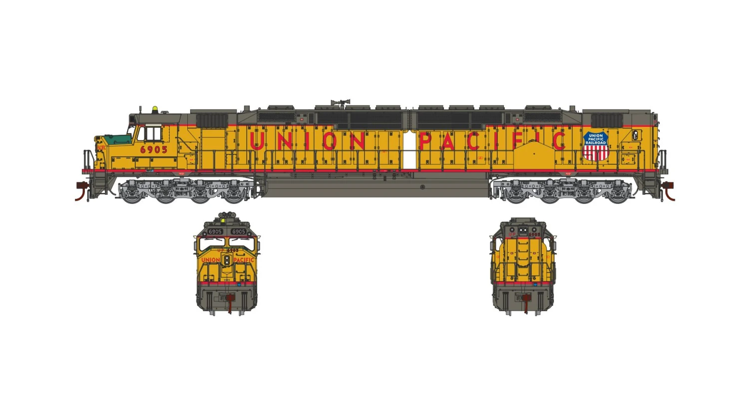 - #6936 Union Pacific preserved heritage service unit, ditch lights, yellow frame stripe, cab-mounted strobe, late anti-climbers, late electrical cabinet