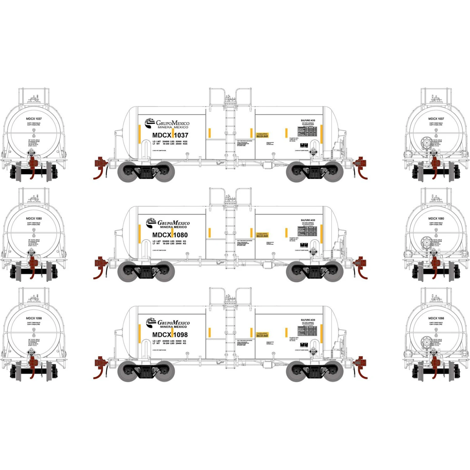 - Full underframe detail: air brake reservoir, control valve, and brake cylinder with plumbing and brake rod details