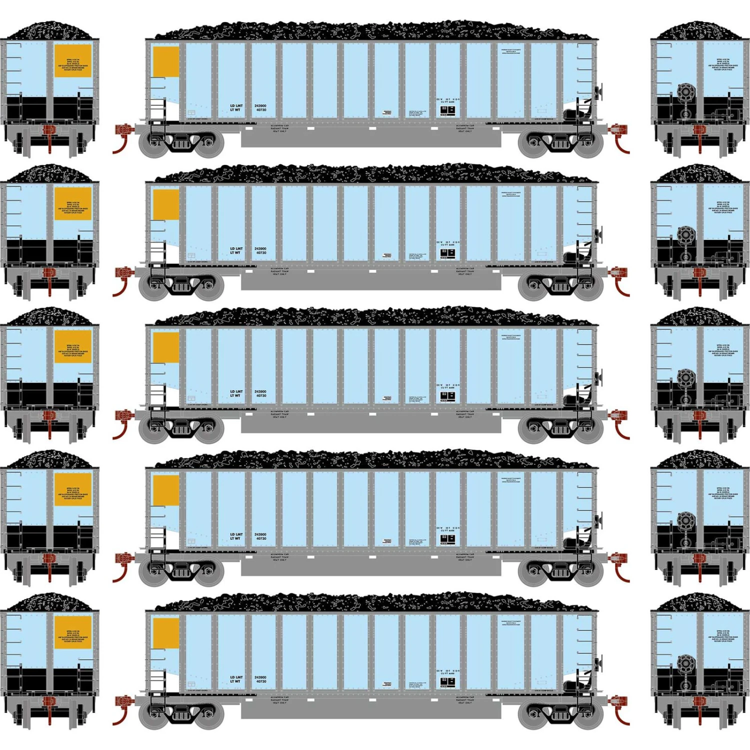 This ‘Bathtub’ design increased the cubic capacity of the car and gave the added advantage of a lower center of gravity for better tracking. Coalporters generally operate in solid unit trains. One end of each car is equipped with a rotary coupler, to allow a train to be fed through a rotary unloader without uncoupling the cars.