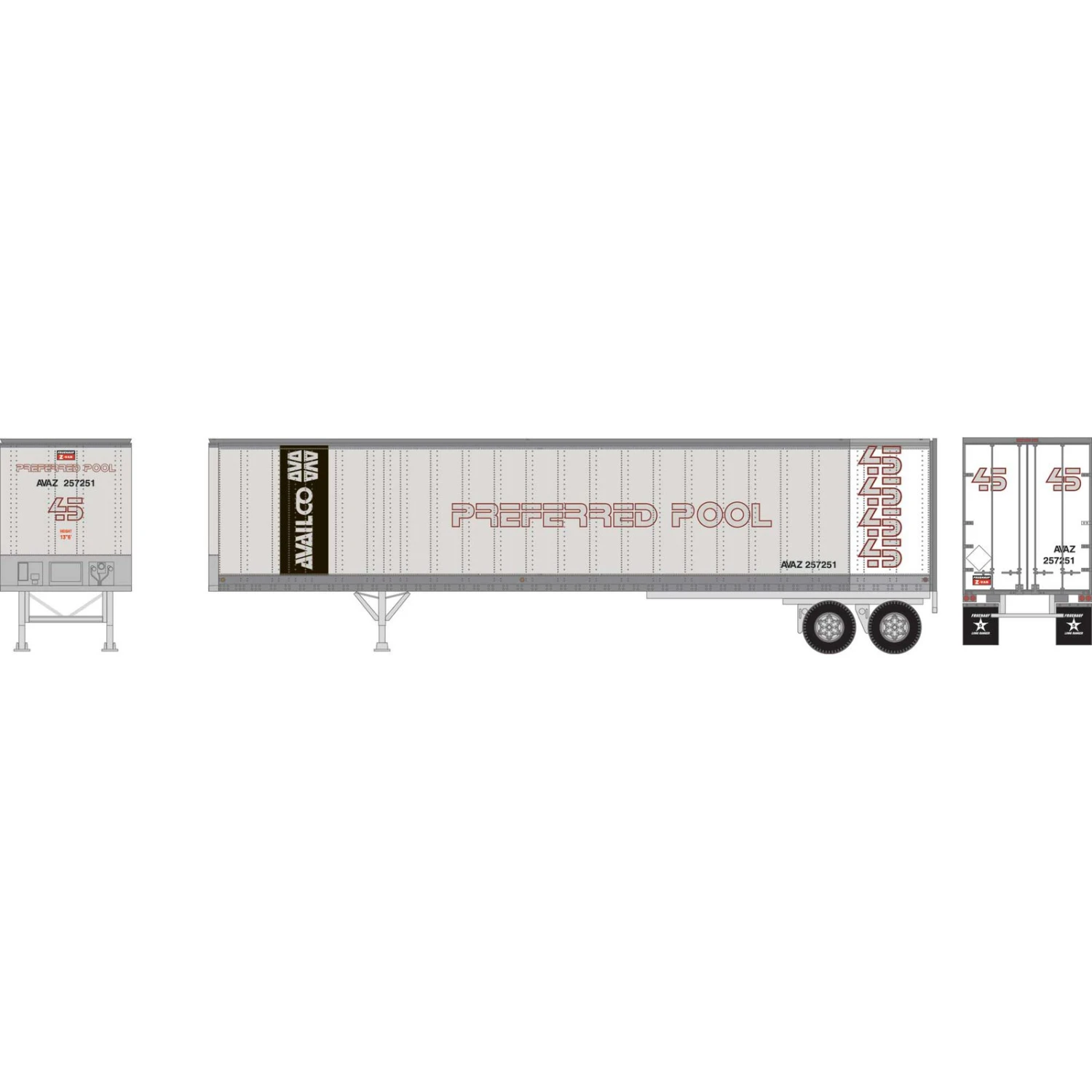 In the 1970s and 1980s, Fruehauf Corporation was one of the more prolific builders of semi-trailers that were designed specifically for intermodal service. Trailer equipment that was designed to be carried on flatcars as part of rail operations usually carried the letter “Z” as the last letter of the reporting mark; hence Fruehauf’s designation of “Z-Van”. Such equipment was built to higher durability standards than normal trailers, as it had to withstand the rigors of both road and rail travel.The Z-van was originally available in a 40’ length; 45’ was offered later. Many of the 40’ trailers were subsequently extended to 45’. Refrigeration equipment was available, as well as different landing gear and door rod configurations. Construction began with the ribbed-side versions, then proceeded to beaded-side construction, with the smooth side version representing the most modern construction method.With three distinct body styles, the Athearn model makes a realistic addition to road or rail scenes from the 1970s to the 2000s.